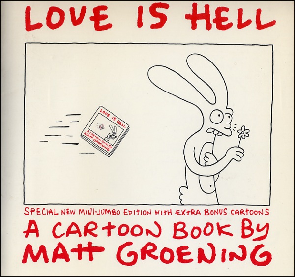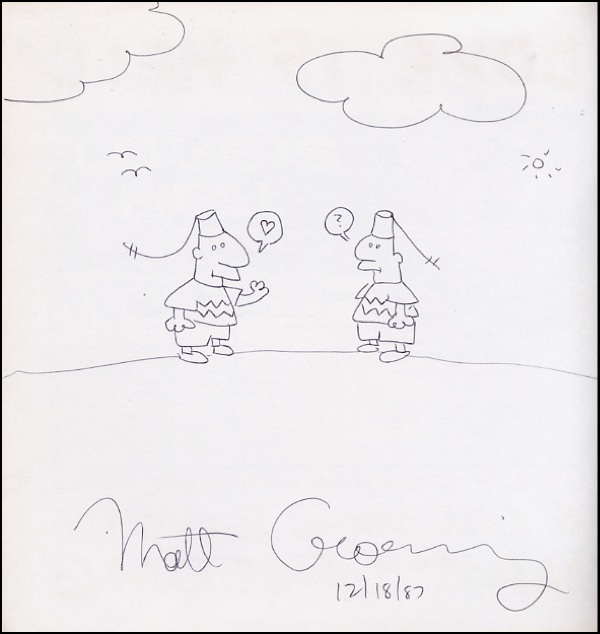Signed book: Love is Hell. NY: Pantheon, 1986. Softcover, 9 x 9. Signed on the inside front cover, “Matt Groening 12/18/87,” and adding a nice sketch of two fezzed gentlemen sharing a tender moment. In fine condition. R&R COA.