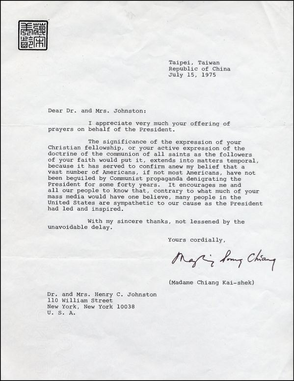 May Ling Soong Chiang, wife of the President of the Chinese National Government. TLS in English, one page, 8.25 x 10.5, her personal black-bordered mourning stationery letterhead, July 15, 1975. In part: “…The significance of the expression of your Christian Fellowship, or your active expression of the doctrine of the communion of all saints as the followers of your faith would put it, extends into matters temporal, because it has served to confirm anew my belief that a vast number of Americans…have not been beguiled by Communist propaganda denigrating the President for some years…” In fine condition, with usual letter folds, one fold through several letters of the signature. R&R COA.
