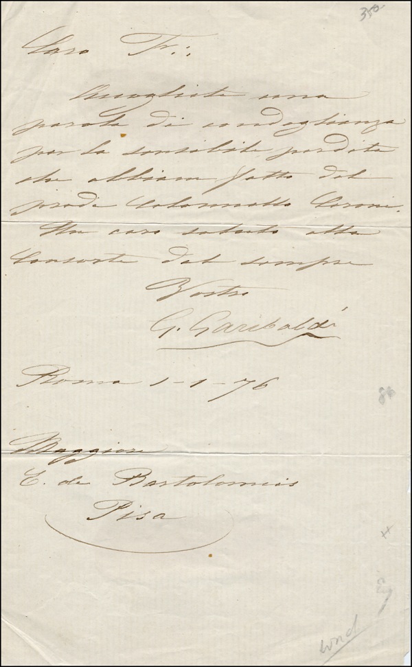 Italian military and nationalist leader famous for his Redshirt attack on Sicily in May 1860. ALS in Italian, signed “G. Garibaldi,” one page, 10.5 x 875 folded to 5.25 x 8.75, 1876. A full page to Major E. deBartolomeis, Pisa, regarding the death “…of the brave Colonel Coroni…” Garibaldi sends his condolences and expresses his sorrow on the colonel’s passing. Accompanied by a complete translation. In fine condition, with integral leaf, usual letter folds, a couple of mild corner creases and unobtrusive pencil notations. Adhesive residue on the leaf but not on the page itself. R&R COA.
