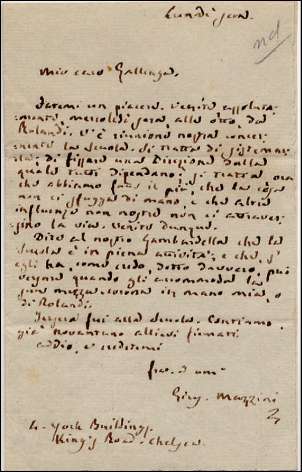 Italian patriot who dedicated his life, much of which was spent in exile, to uniting his country under a republic. ALS signed “Gius. Mazzini,” one page, 4 x 6.25, no date. In part: “Dear Gallenga…Do not fail to come Wednesday evening at 8:00 at Rolandi’s. We have a meeting concerning the school. It is the question of organizing and establishing a management to which everyone should be bound. It is the question of having done so much we have to keep it in our own hands and prevent the interference of any outside influence. Come then. Tell our gambardella that the school is in full activity and if he really means what he said as I quite believe he can send at his earliest convenience his half crown to me or to Rolandi’s…we already have 91 primary students…” Accompanied by a complete English translation. In fine condition, with light vertical fold through a letter of the signature, a few small areas of light discoloration affecting nothing. R&R COA.