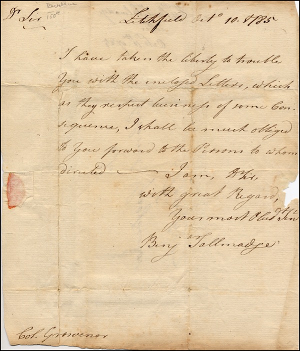American Revolutionary colonel, who had custody of Major Andre and walked him to the scaffold. ALS signed “Benj. Tallmadge,” one page, 7.25 x 8.5, October 10, 1785. Letter to a Colonel Grosvenor. In part, “I have taken the liberty to trouble you with the enclosed Letters…I shall be much obliged if you forward to the Persons of whom directed.” In very good condition, with tape reinforcement to folds on reverse, scattered toning, small pinholes of paper loss to folds and area of paper loss to right edge. R&R COA.