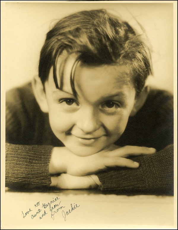 Known for playing brats, squealers and bullies, he was labeled on the Paramount sets as "The Kid Everybody Wants to Spank." He appeared as Sid Sawyer in the early Mark Twain film classic Tom Sawyer and he followed with Finn and Hattie, Huckleberry Finn, Skippy, Topaze and Alice in Wonderland (as The Doormouse). Great vintage sepia matte-finish 10.5 x 13.25 close up portrait of the cute young actor, signed and inscribed in fountain pen “Love to Aunt Bernice and Leon from Jackie.” In fine condition, with traces of silvering in the darker areas, a small crease to the lower left corner. R&R COA.