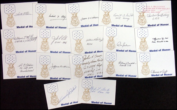 Ink and felt tip signatures of seventeen Medal of Honor recipients on individual 5 x 3.5 white cards, which bear an image of the medal. Signers are: Walter Ehlers, Michael Daly, James Williams, Robert Scott, Charles MacGillivery, William McGonagle, John Levitow, William Lawley, Dan Jenkins, Thomas Hudner, R. E. Galer, Jefferson LeBlanc, John Crews, William Crawford, Clarence Craft, Lloyd Burke and Vernon Baker. In fine condition. R&R COA.