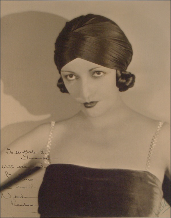 Ballerina, set designed, costume designer, actress and second wife of Rudolph Valentino. She exhibited such control over his films that Paramount barred her from her husband’s sets; they divorced shortly afterward. Vintage sepia matte-finish 11 x 14 photo, signed and inscribed in fountain pen “To Mathilda E. Scammodan, With my wish for your success, Most sincerely, Natacha Rambova.” Matted and framed to an overall size of 16.5 x 19. In fine condition, with a couple light creases, a bit of contrast to part of inscription against dark portion of photo and photographer’s signature “Ball” in the lower right. R&R COA.