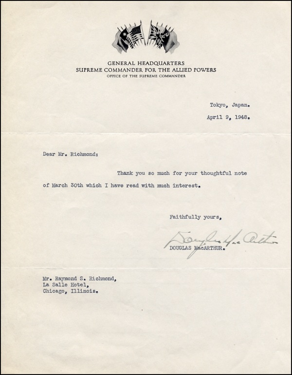 TLS, one page, 8 x 10.5, General Headquarters, Supreme Commander for the Allied Powers letterhead, April 9, 1948. Brief letter written from Tokyo. In full, “Thank you so much for your thoughtful note of March 30th which I have read with much interest.” Nicely signed at the conclusion by MacArthur. In fine condition, with expected mailing folds. R&R COA.