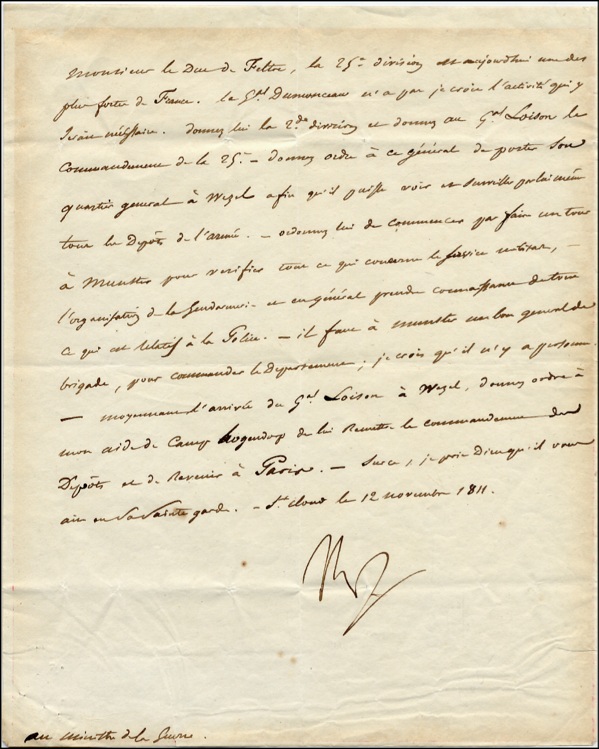 LS signed rapidly signed with his usual “Np,” one page, 7.25 x 9, November 12, 1811. Letter to the Minister of War, the Duke de Feltre, with various military orders for Generals Dumonceau and Loison. In full, “The 25th Division is today one of the strongest French Divisions. I do not believe that General Dumonceau has the energy it requires. Give him the 2nd Division and give command of the 25th to General Loison. Order this General to establish his headquarters in Wezel so that he can supervise all the army Depots. Order him to start by going to Munster to verify all that concerns military service, the organization of the Gendarmerie and, generally to become acquainted with all that relates to the Police. We need a good Brigadier General in Munster to command the Department; I don’t think that there is anybody - upon arrival of General Loison in Wezel I order to my aide de camp…to turn over command of the Depots to him and to come back to Paris.” In very good condition, with light uniform overall toning from previous framing, several folds, overall wrinkling, heaviest at the bottom, and a few small spots. COA John Reznikoff/PSA/DNA and R&R COA.