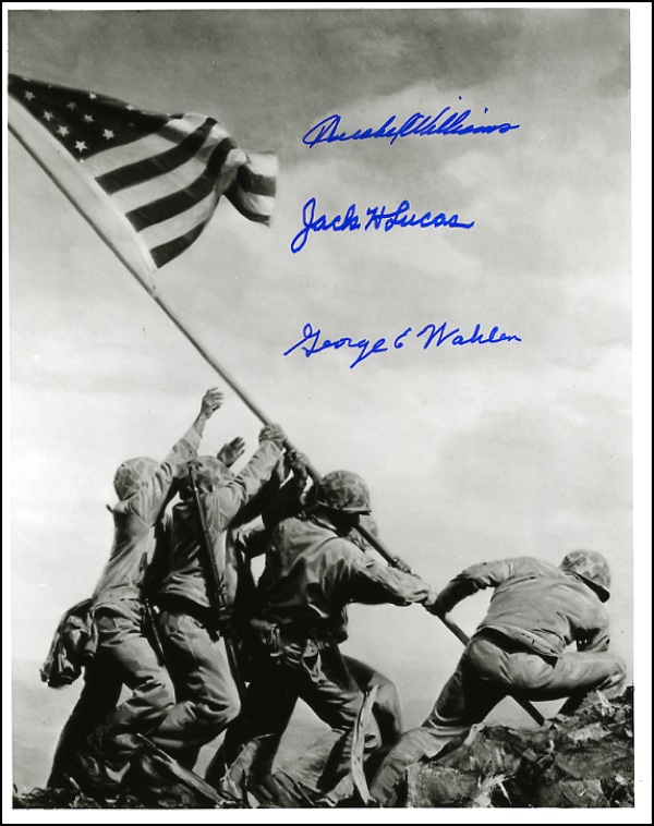 Glossy 11 x 14 photo of the Mount Surabachi flag raising on Iwo Jima, signed in blue felt tip by the last three surviving Medal of Honor recipients from the island, Hershell Williams, Jack Lucas and George Wahlen. In fine condition. Accompanied by a Certificate of Authenticity from Broadway Rick’s Strike Zone featuring photos taken at time of signing and R&R COA.
