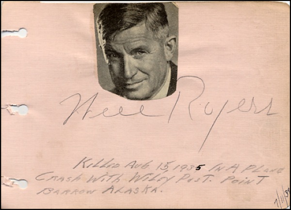 Actor and humorist, a spokesman for common folks, known for his homespun humor and offhand manner; killed in an Alaskan plane crash with aviator Wiley Post in 1935. Vintage pencil signature, “Will Rogers,” on a light pink 6.5 x 4.25 album page. Clipped photo affixed directly above signature, collector’s notations along bottom and a touch of light soiling, otherwise fine condition. R&R COA.