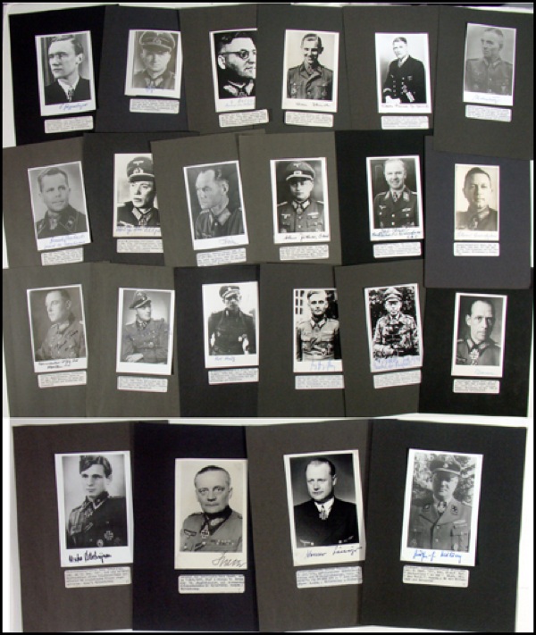 Lot of twenty-two signed photographs of Knight’s Cross Winners, each signed in blue or black felt tip, with several of the Recipients adding ranks. The photographs depict each in uniform, various finishes, each approximately 4 x 6. The lot includes: Friedrich Guggenberger; Hermann Heinrich Behrend; Theodor Busse, Werner Damsch; Wilhelm Dommes; Heinrich Eberbach; Walther-Peer Fellgiebel; Hermann Hölter; Arthur Jüttner; Karl Kessel; Ernst König; Ernst August Krag; Karl Kreutz; Heinz-Georg Lemm; Wolfgang Pickert; Werner Ranck; Karl Rhein; Carl Rodenburg; Remy Schrijnen; Hans Speth; Werner Töniges; and, Günther-Eberhardt Wisliceny. The photos are each loosely affixed to a larger page with typed, biographical information (in German) affixed to labels beneath the photos. In overall fine condition, with minor smudging to two or three signatures. R&R COA.