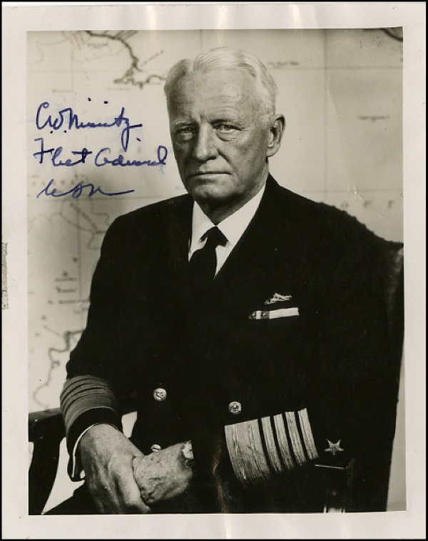 Dignified pearl-finish 4 x 5 portrait of the older Nimitz seated and in uniform, signed “C.W. Nimitz, Fleet Admiral, USN” in fountain pen. In fine condition, with scattered light creasing, a bit of adhesive residue in the left margin, a bit of feathering to a few letters. R&R COA. R&R COA.
