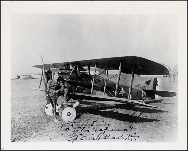 Glossy 10 x 8 photo of young Rickenbacker standing in front of his plane with his boot on its wheel, signed and inscribed in fountain pen “With affection to [?] Cpt. Eddie Rickenbacker” after which he’s written “1918” and “1966.” In very good condition, with some portions of signature and inscription lighter than others due to uneven ink flow, corner creases, a couple of nicks to the borders. R&R COA.