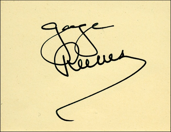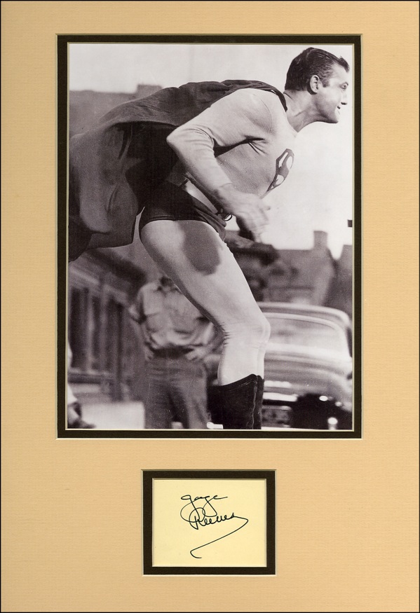 Best remembered for the role of TV’s Superman, he died mysteriously at the age of 45, either as a result of suicide or homicide. The controversy continues. Vintage ink signature, “George Reeves,” on an off-white 3 x 2.25 album page. Double matted with a photo of Reeves as Superman, to an overall size of 11 x 16. In fine condition. PSA/DNA COA and R&R COA.