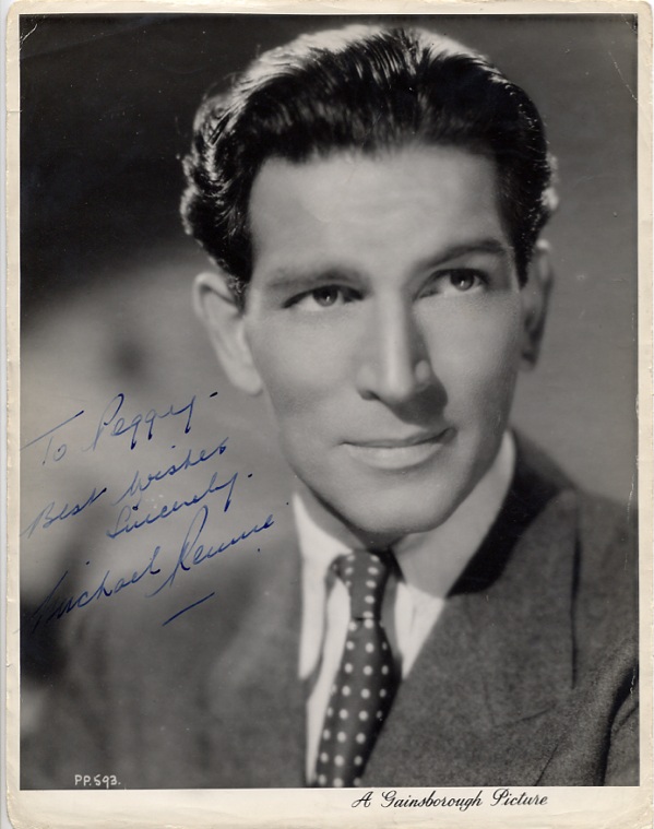 Vintage glossy 8 x 10 Gainsborough Pictures publicity photo, signed and inscribed in fountain pen “To Peggy - Best wishes, Sincerely, Michael Rennie.” In very good condition, with scattered creasing and wrinkling. R&R COA.
