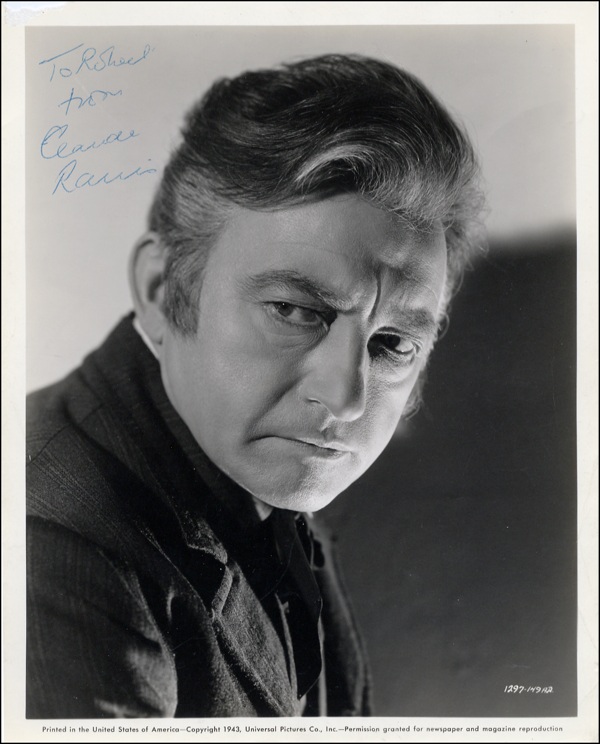 Vintage glossy 8 x 10 photo of Rains looking suspiciously to his right, in a scene from 1943’s Phantom of the Opera, signed and inscribed in blue ballpoint “To R. Sheel.” In very good condition, with scattered creasing, chip to the upper left corner, a bit of skipping to the signature due to uneven ink flow, collector’s pencil notations on the reverse. R&R COA.