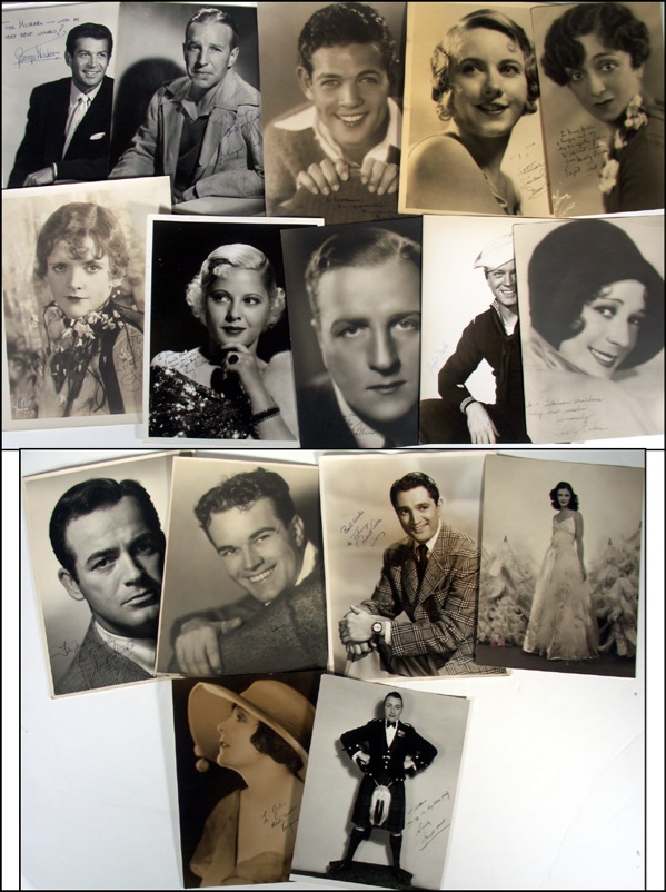 Lot of sixteen vintage photos, almost all 11 x 14 or slightly smaller, each signed in ink or fountain pen by the respective actor or actress pictured, with most adding inscriptions. Signers are: Blanche Sweet, Virginia Valli, Mary Carlisle, Lou Calhern, Alfred Drake, Sally Eilers, Brenda Frazier, Robert Alda, George K. Arthur, Nick Stuart, Mark Stevens, Irene Purcell (Bull), Molly Picon, David Rollins, George Nader and Lloyd Nolan. In very good condition, with trimmed edges to several photos and some scattered surface marks and creases to a few photos. R&R COA.