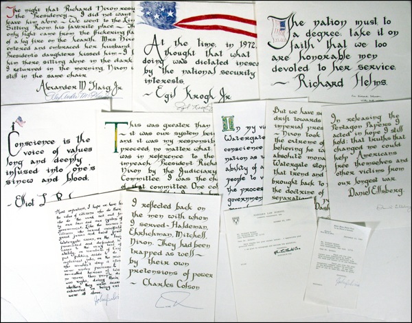 Lot of twelve items, including ten hand-calligraphed quotes (done in another hand), attributed to men closely associated with the Watergate hearings, and signed by each individual at the conclusion. Included: Archibald Cox (“In my view, Watergate proved the conscience of the nation as well as the ability of a self-governing people to vindicate, by the process of open government, their own moral sense”); Samuel Dash; Daniel Ellsberg (“In releasing the Pentagon Paper I acted in hope I still hold: that truths that changed me could help Americans free themselves and other victims from our longest war.”); Charles Colson (“I reflected back on the men with whom I served - Haldeman, Ehrlichman, Mitchell, Nixon. They had been trapped as well - by their own pretensions of power.”); John J. Sirica (“…or members of Congress who put politics aside to do their unpleasant jobs, or the news reporters who wouldn’t drop a story when they were under pressure to do so, the so-called heroes of Watergate were more than people doing what was right, doing their jobs whether they were scared or exhausted or being criticized, or were all alone.”); Alexander M. Haig, Jr.; Richard Helms; Egil Krogh Jr. (“At the time, in 1972, I thought that what we were doing was dictated inescapably by the national security interests.”); Elliot L. Richardson; Peter W. Rodino. Also included: an TLS from Sirica acknowledging his signing the calligraphed quote, and a TLS from Archibald Cox, acknowledging his signing of the quote. In overall fine condition, with the occasional mild crease or corner bend. R&R COA.