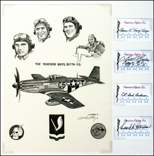 Felt tip signatures of aces Thomas Hayes, OBee O’Brien, C. E. “Bud” Anderson and Richard Peterson on individual off-white American Fighter Ace cards. All four are affixed (in a removable fashion) to a 14.75 x 15 piece of foam-core, with an 11 x 14 Lonnie Ortega print of the Yoxford Boys. In fine condition. R&R COA.