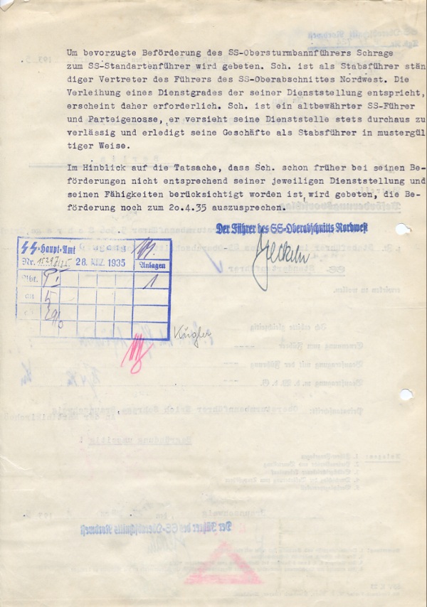 In November 1941 Jeckeln was appointed SS- and Police Chief for Northern Russia. In this capacity he was responsible for the mass murder of thousands of Soviet Jews. After the war Jeckeln was handed over to the Soviet authorities and sentenced to death. He was executed in Riga, Latvia, in 1946. DS, in German, signed “Jeckeln,” one page both sides, 8.25 x 11.75, March 23, 1935. Official document, in German, signed twice in fountain pen by Jeckeln, once on each side. In fine condition, with expected stamps, folds and notations and punch holes to left edge. R&R COA.