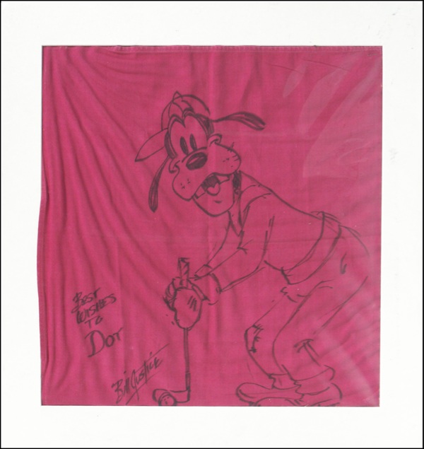 One of Disney’s original animators popularly called the “Nine Old Men.” Original signed and inscribed felt tip sketch of Goofy putting a golf ball on a light maroon 16.75 x 17.5 cloth dinner napkin. Matted to an overall size of 21.25 x 22.5. In fine condition. R&R COA. Oversized.