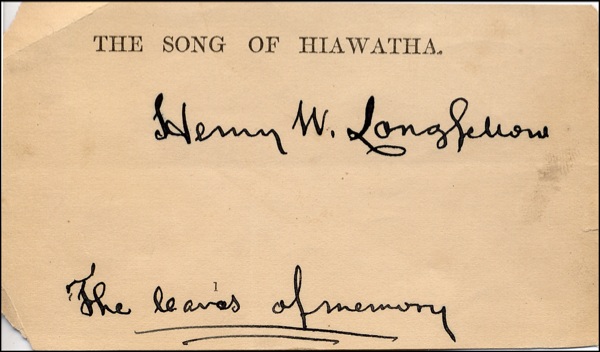 Ink signature, “Henry W. Longfellow, the leaves of memory,” on an off-white 4.25 x 2.5 upper portion of the half-title page of one of his most famous works, The Song of Hiawatha. “The leaves of memory is from his “The Fire of Drift-Wood.” Great association! In very good condition, with three small corner chips, trivial soiling to the left and right edges, edge toning. R&R COA.