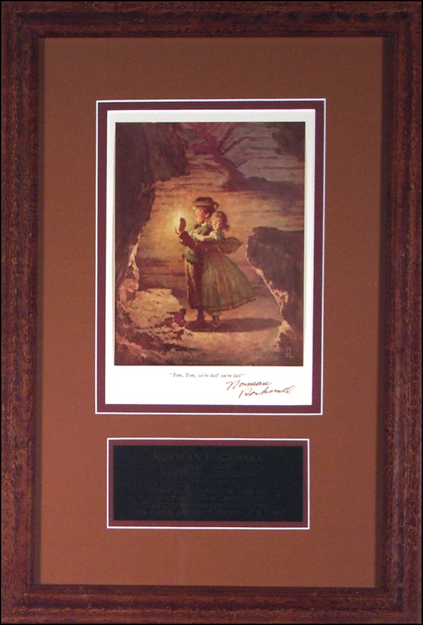 Color 5.25 x 7.5 reproduction from his illustration of the Mark Twain classic The Adventures of Tom Sawyer (Tom Sawyer and Becky Thatcher in a Cave), signed in ink beneath the image, attractively double-matted and framed with an explanatory plaque to an overall size of 11.25 x 16.5. In fine condition. R&R COA.