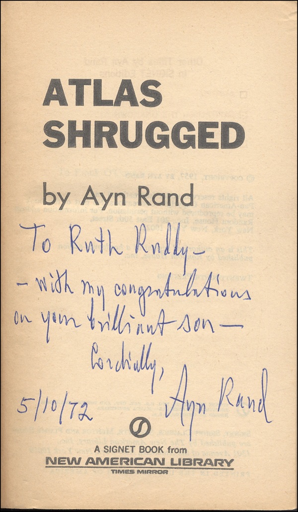 Russian-born writer whose “objectivist” philosophy is at the core of her novels, which include The Fountainhead and Atlas Shrugged. Signed book: Atlas Shrugged. Signet, 1957. Paperback, 4.25 x 7, 1084 pages. Signed and inscribed in blue ballpoint on the title page, “To Ruth Ruddy–with my congratulations on your brilliant son–Cordially, Ayn Rand 5/10/72.” In very good condition, with a light shade of toning to signed page, light wear to covers and some mild sunning to spine. COA John Reznikoff/PSA/DNA and R&R COA.