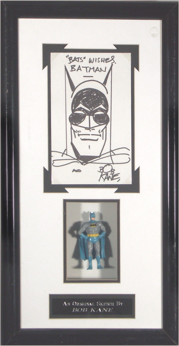 Original felt tip sketch of the Caped Crusader on a white 5 x 8 sheet, signed, “‘Bats’ wishes, Batman and Bob Kane.” Matted and framed with an action figure to an overall size of 11.25 x 21. In fine condition. R&R COA.