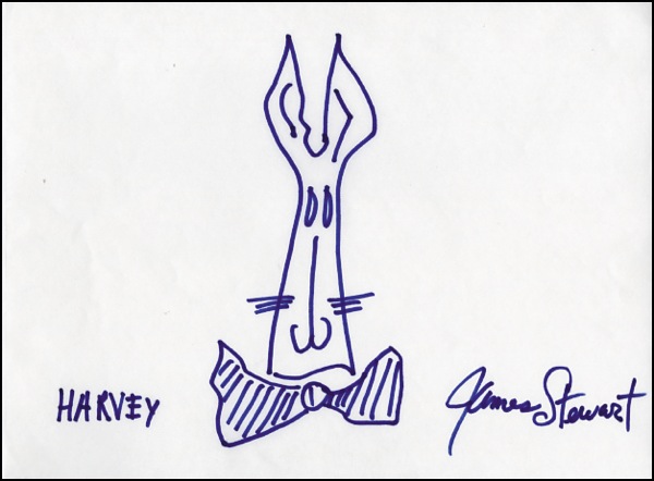 Original signed felt tip sketch of Harvey on a white 12 x 9 sheet, signed “James Stewart” and “Harvey” in blue felt tip by the actor. In fine condition. R&R COA.