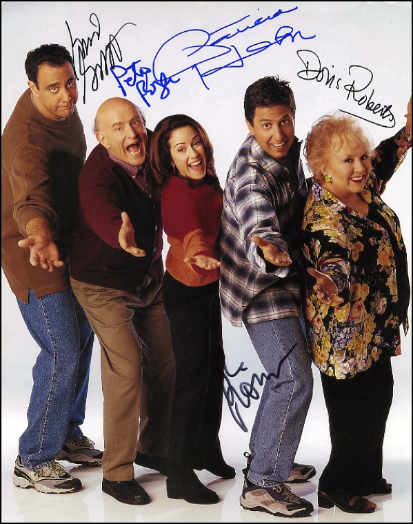 Color satin-finish 11 x 14 cast photo, signed in blue and black felt tip by five: Brad Garrett, Peter Boyle, Patricia Heaton, Ray Romano, and Doris Roberts. In fine condition, with a few dings at top edge. R&R COA.