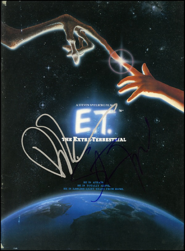 Original 1982 Japanese program book for the movie E.T., 8.75 x 12, signed on the cover in blue felt tip by Steven Spielberg and in silver ink by Drew Barrymore. In fine condition, with moderate contrast to Spielberg due to dark background. R&R COA.