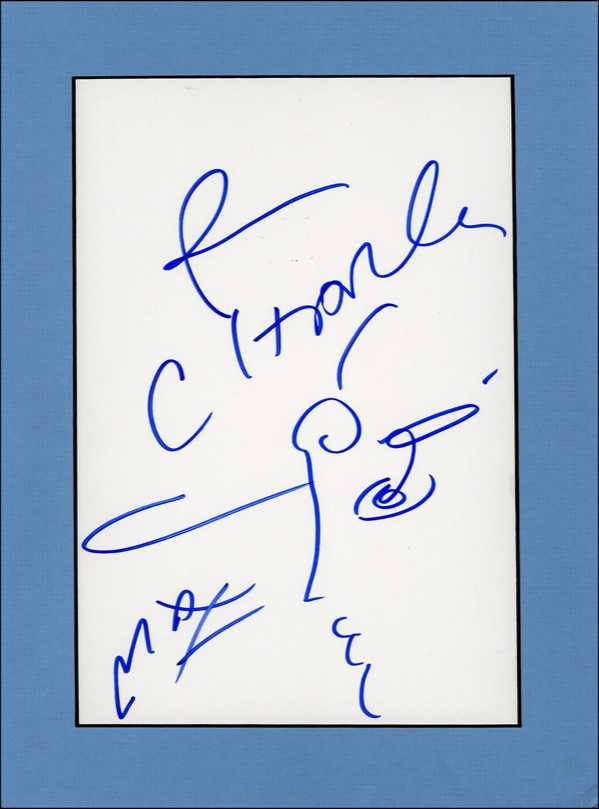 Artist noted for his undulating graphic designs in bright, vibrating colors. Original signed and inscribed felt tip sketch of a profile portrait on an off-white 6.75 x 10.5 card, signed and inscribed “For Charlie, Max.” Matted to an overall size of 9 x 12. In fine condition. R&R COA.