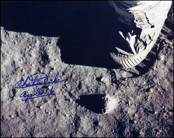 Lot of two items: Signed book: Reaching for the Moon. First edition. NY: Harper Collins, 2005. Hardcover with dustjacket, 9 x 11.25. Signed in black felt tip on the title page by the author, Buzz Aldrin, and illustrator, Wendell Minor. Also included: a color satin-finish 10 x 8 photo of a footprint on the moon, signed in blue felt tip, “Charlie Duke, Apollo 16.” In fine condition. R&R COA.