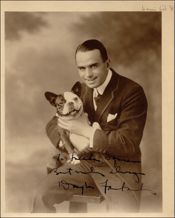 Wonderful vintage matte-finish 8 x 10 photo of Fairbanks with a canine pal, signed and inscribed in fountain pen, “To Lucita Squires, Best wishes always, Douglas Fairbanks.” In fine condition, with mild, even toning, trivial corner bend, and pencil notation in top margin. R&R COA.