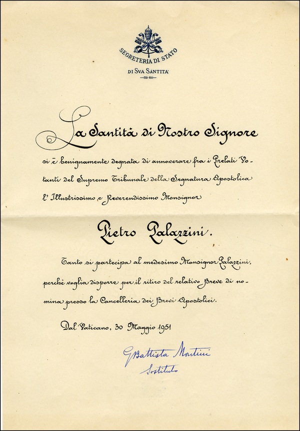 Born Giovanni Battista Montini. Elected Pope in 1963. As pope, he issued encyclicals for clerical celibacy and against artificial birth control. DS, in Italian, signed “G. Battista Montini, Sostituo,” one page, 9 x 13, Segreteria Di Stato Di Sua Santita letterhead, May 30, 1951. Document recognizing and nominating Pietro Palazzini, to the Supreme Tribunal of the Apostolic Signature (del Supremo Tribunale della Segnatura Apostolica). Signed at the bottom in blue ink by the future Pope. After Cardinal Montini became Pope he created Pietro Palazzini as a Cardinal in 1973. Pope John Paul II eventually presided over his funeral when he died in October 2000. In fine condition, with a bisecting horizontal fold. R&R COA.