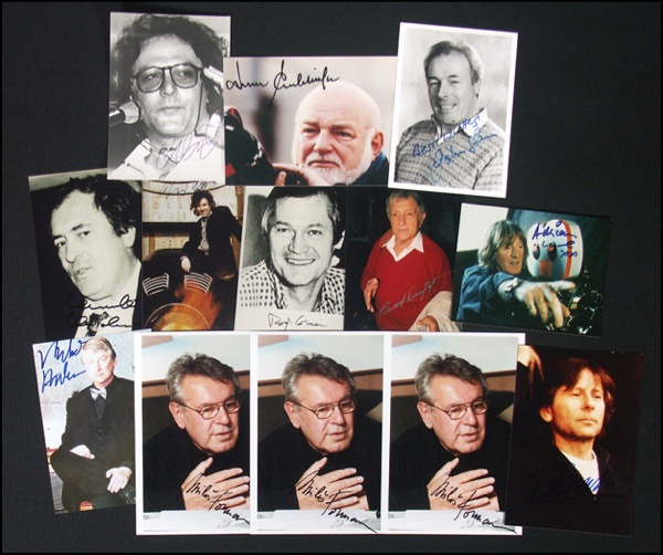 Lot of thirteen glossy photos, each approximately 5 x 7 or 7 x 5, some color, each signed in ink by the respective director pictured. Included: Bernardo Bertolucci, Tim Burton, Roger Corman, Edward Dmytryk, Milos Forman (3), John Glen (who has written on the back, “I have written a book ‘For My Eyes Only’, Amazon.com.”, Adrian Lyne, George Miller, Mike Nichols, Roman Polanski and John Schlesinger. In overall fine condition. R&R COA.