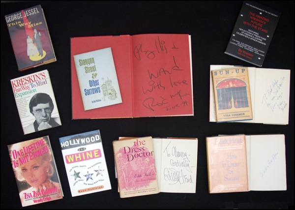 Lot of thirteen signed books, all from the residence of Phyllis Diller, each signed on the opening pages by the respective author, with eight signed and inscribed to Diller and the remainder signed by the author. Signers are: Rod McKuen (2), Edith Head (3), Kreskin (2), Boze Hadleigh, Zsa Zsa Gabor, Lula Vollmer, Hedda Hopper (2, one inscribed to Bob Hope) and George Jessel. In fine overall condition. R&R COA. Oversized.
