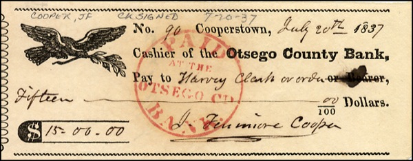 Check, 5.75 x 2.25, filled out and signed by Cooper, “J. Fenimore Cooper,” payable to Harvey Clark or order for $15.00, July 20, 1837. Pencil notation along top and a bank stamp over beginning portion of signature, otherwise fine condition. R&R COA.