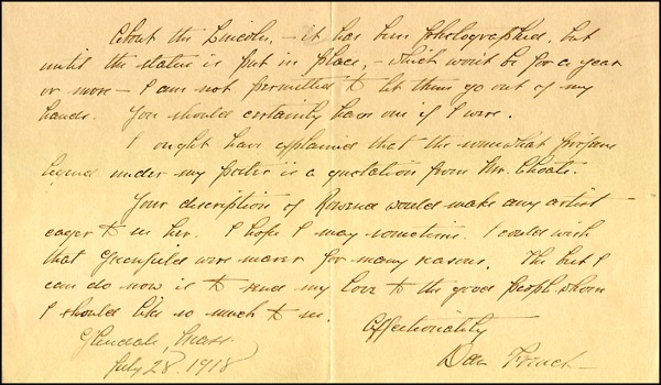 Sculptor best known for his monumental work of statuary including the Minute Man, the seated Lincoln, and the Lincoln Memorial. ALS signed “Dan French,” one page both sides, 10 x 6, July 28, 1918. Letter to a friend mentioning his work on the Lincoln statue. In part, “About the Lincoln - it has been photographed, but until the statue is put in place - which won’t be for a year or more - I am not permitted to let them go out of my hands. You should certainly have one if I were.” In fine condition, with light overall toning. R&R COA.