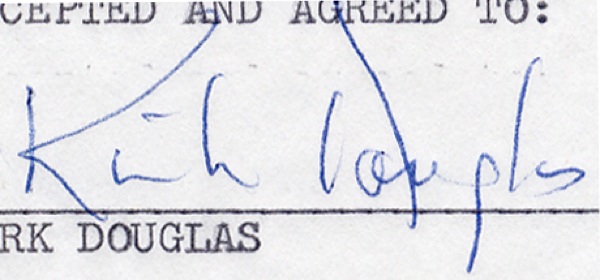 DS, thirteen pages, 8.5 x 11, February 27, 1964. A detailed contract for Douglas’ appearance in the 1964 war epic In Harm’s Way, directed by Otto Preminger. In fine condition, with small PSA/DNA sticker affixed to corner of final page, usual file and staple holes, and light handling wear. Accompanied by a certificate of authenticity from PSA/DNA and R&R COA.