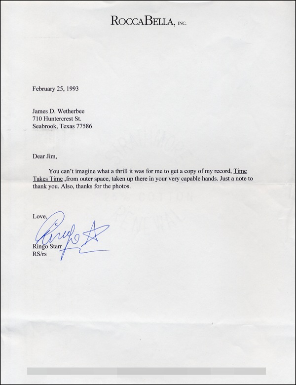 One-of-a-kind TLS, signed “Ringo” with his customary drawn star surname, one page, 8.5 x 11, RoccaBella, Inc. letterhead, February 25, 1993. Ringo sends thanks to NASA astronaut James D. Wetherbee. In full: “You can’t imagine what a thrill it was for me to get a copy of my record, Time Takes Time, from outer space, taken up there in your very capable hands. Just a note to thank you. Also, thanks for the photos.” Wetherbee flew on six space flights from 1990 to 2002. He likely carried Ringo’s record into orbit aboard the shuttle Columbia during mission STS-52 (October 22–November 1, 1992). In fine condition, with usual mailing folds (away from signature) and some light wrinkling. COA Roger Epperson/PSA/DNA and R&R COA.