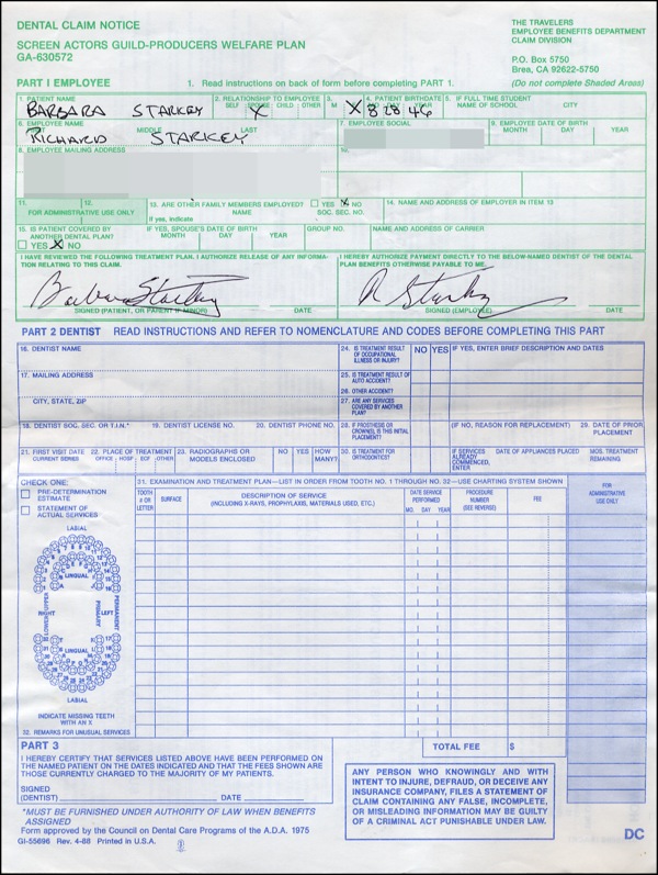 DS, one page, 8.5 x 11, no date. A partially printed dental insurance claim form for Ringo’s wife, filled out and signed by her, “Barbara Starkey,” also signed with Ringo’s authorization signature, “R. Starkey.” In fine condition, with horizontal fold (away from signatures) and some mild wrinkling. COA Roger Epperson/PSA/DNA and R&R COA.