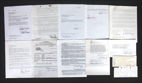 Lot of twelve DS, some single page and some multi-page, each signed in ballpoint or felt tip by a different actor or actress. Signers are: George Burns, signing “George ‘Bart’ Burns,” Robert Urich, Kate Jackson, Jeff Conway, Arthur O’Connell, Randy Quaid, Dane Clark, Kenny Rogers, Gary Busey, Lou Crosby, Dick Martin and Rosie Perez. In fine condition, with usual document wear. R&R COA.