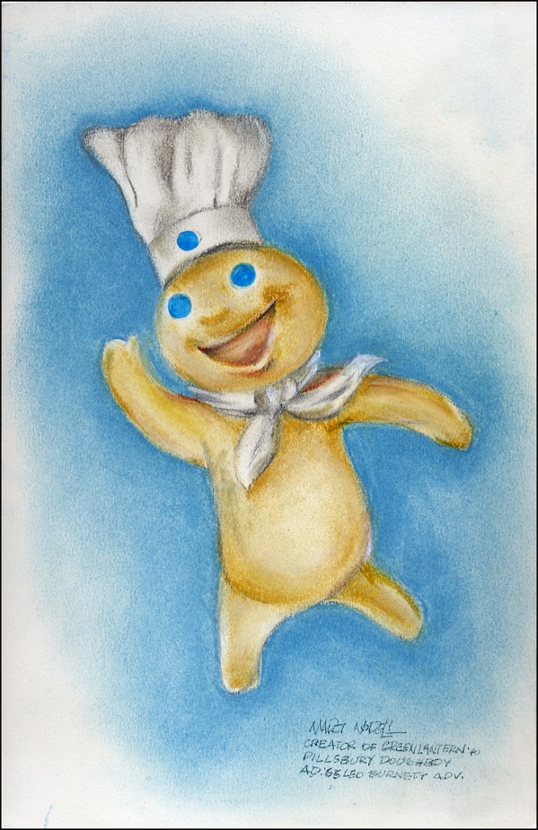 Creator of the Green Lantern and the Pillsbury Doughboy. Original signed colored pencil sketch of the Pillsbury Doughboy on an off-white 7.5 x 11.5 piece of artists board. Signed in the lower right in ink, “Mart Nodell, Creator of Green Lantern ‘40, Pillsbury Doughboy, AD ‘65, Leo Burnett Adv.” In fine and fresh condition. R&R COA.