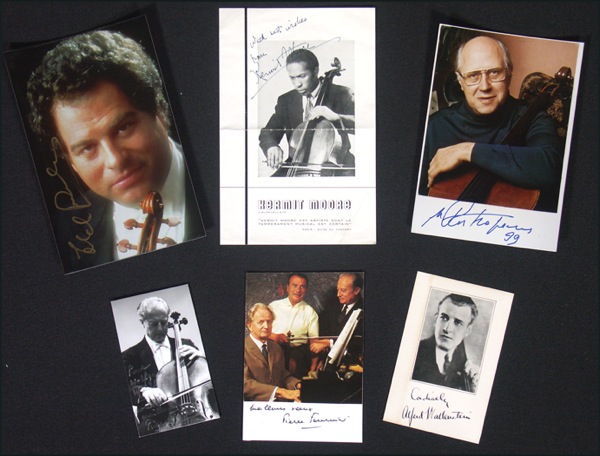 Lot of six photos (three color) ranging in size from 2.75 x 4.5 to 5.25 x 8, each signed in ink or felt tip by the player pictured: Alfred Wallenstein, Pierre Fournier (two, one inscribed), Itzhak Perlman, Mstislav Rostropovich, and Kermit Moore (program cover). In fine condition, with scattered toning, dings, and surface impressions, and horizontal crease to Moore (away from signature). R&R COA.