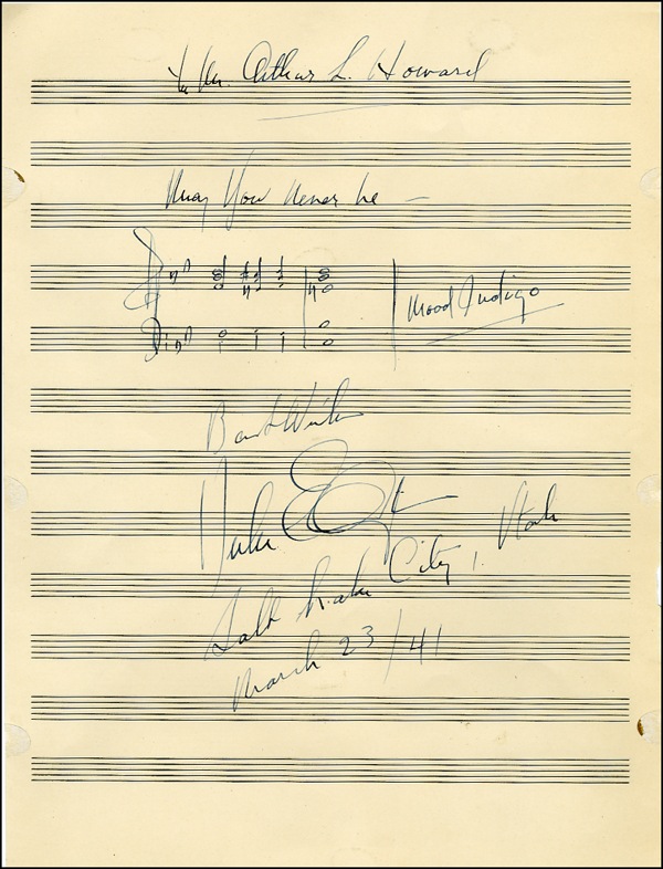 One of the great figures in American jazz, Ellington was one of the first to use classical themes in jazz, and is still considered one of the most innovative composers in jazz history. At the height of his career Ellington toured the world with his orchestra, and composed such standards as "Mood Indigo." AMQS on 9.5 x 12.5 12-stave musical paper with a couple of bars of Mood Indigo. Ellington inscribes to Arthur Howard and writes “May you never be” above the notes, and signs, “Best wishes, Duke Ellington, Salt Lake City, Utah, march 23/41.” In fine condition, with few small areas of adhesive residue in the edges, slight rough right edge. R&R COA.