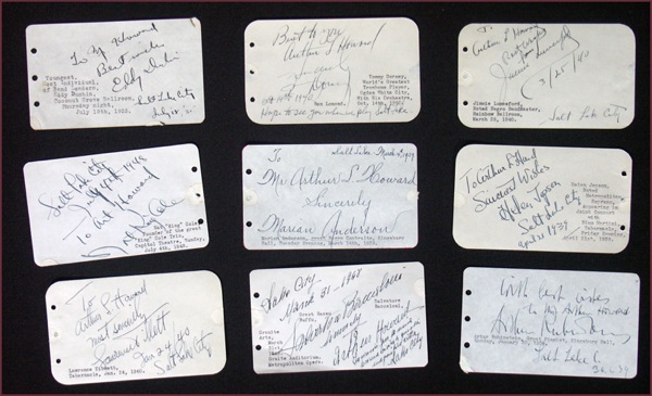 Lot of nine signatures on individual 5 x 3 white pages. The lot includes: Eddy Duchin, Tommy Dorsey, Jimmie Lunceford, Nat "King" Cole, Marian Anderson, Helen Jepson, Lawrence Tibbett, Salvatore Baccaloni and Arthur Rubinstein. All are inscribed to Art. Howard, and each musician has added the place (Salt Lake City) and date (most are mid-to-late 1930s). In fine condition, with small punch holes to left edges, a couple of small areas of adhesive residue in the margins of each. R&R COA.
