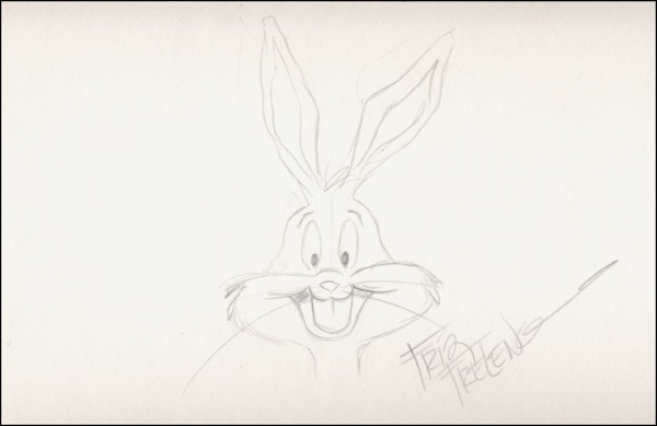 One of the most prolific and successful animators of the 20th century, Isadore "Friz" Freleng was the director of Merry Melodies and Looney Tunes for Warner Brothers. Original signed pencil sketch, a portrait of the smiling Bugs Bunny on a heavy white 10.25 x 6.5 card. In fine condition. R&R COA.