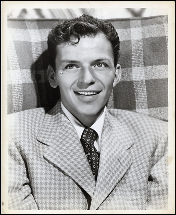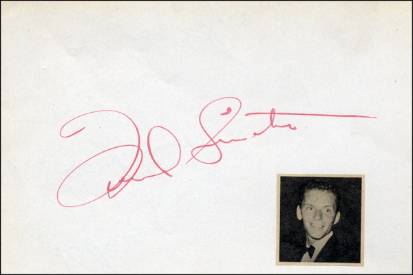 Vintage red fountain pen signature on a white 5.5 x 3.75 card. Accompanied by an unsigned glossy photo of the young entertainer. In fine condition, with a few faint surface impressions, minor show through from signature on the reverse, small magazine photo of Sinatra affixed in the lower right corner. R&R COA.
