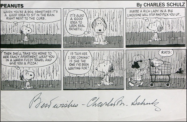 Photocopy of a Peanuts strip, 15.5 x 10.25, signed in black felt tip in the blank lower margin, “Best wishes—Charles M. Schulz.” In fine condition, with bisecting vertical crease touching signature, corner bends, and a few tiny tears at left edge. R&R COA.