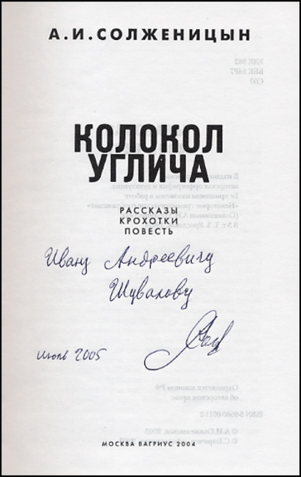 Signed Russian-language book: The Bell of Uglich. Moscow, 2004. Hardcover, 5.25 x 8, 588 pages. Signed and inscribed in Russian on the title page, “To Ivan Andreyevich Shuvalov, July 2005, Alexander Solzhenitsin.” The book is an anthology of Solzhenitsin’s writings from 1959 to 1998. In fine condition, with light rubbing to covers. R&R COA.